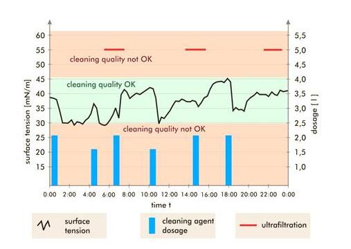 以上案例,通過連續(xù)對(duì)表面活性劑動(dòng)態(tài)表面張力的監(jiān)測(cè),清晰可靠地得知清洗池的表活性劑濃度的情況,以此反映清洗池的清洗能力。可根據(jù)數(shù)據(jù)補(bǔ)充適量表面活性劑,保證穩(wěn)定的清洗效果,從而達(dá)到清洗工藝的最優(yōu)化。