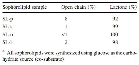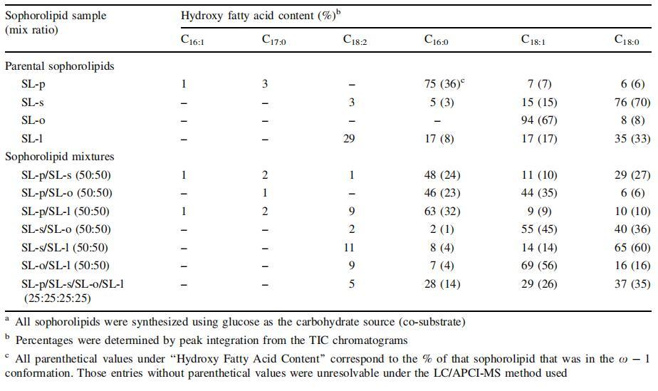 表1:通過LC/APCI MSa測(cè)定的由C.bombicola從棕櫚酸(SL-p)、硬脂酸(SL-s)、油酸(SL-o)、亞油酸(SL-l)酸生產(chǎn)的槐脂的結(jié)構(gòu)含量(開鏈與內(nèi)酯)