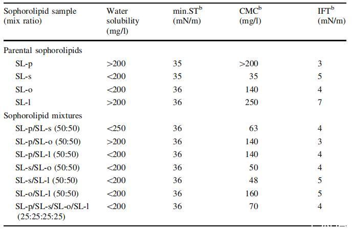 4個親代SLs中的每一個都產生了35–36 mN/m的可比最小ST,但CMC值明顯不同(表3)。 SL-p和SL-l的CMC值均大于200 mg/l,而SL-s和SL-o的CMC值分別為35 mg/l和140 mg/l。 IFT值范圍為3 mN/m(SL-p)至7 mN/m(SL-l)。 為了控制SLs的表面活性,以50:50的混合比制備混合物,并重新評估其性能。 各混合物的內酯分布見表2。 經分析,最小ST和IFT相對不變,但CMC值確實因SL混合物而異。 通過混合獲得了介于48 mg/l和140 mg/l之間的臨界膠束濃度。 有趣的是,CMC值最低的SL混合物都含有SL-s成分。 特別是SL-s的CMC值為35 mg/l; 即使是以25:25:25:25的比例包含所有4種親本SL的混合物,其CMC值(70 mg/l)也比不含SL-s成分的其他混合物低。 這些數據表明,SL-s對水的表面活性性能的影響更為顯著。 通過使用較少的SL-s,可以實現相等的最小ST和IFT。 性能控制和高產量將通過降低成本最終有助于SLs的工業應用。 這些數據還指出,通過將不同的SLs混合在一起以獲得所需的性質,可以在一定程度上控制SLs的表面活性性質。 雖然未達到表明這些SLs單獨具有優越表面活性劑性能的最低標準,但其性能可能足以允許其作為石化表面活性劑添加劑的使用量增加,以便在大量使用表面活性劑的應用中盡量減少不利的環境影響。 SL-p和SL-l的CMC值均大于200 mg/l,而SL-s和SL-o的CMC值分別為35 mg/l和140 mg/l。IFT值范圍為3 mN/m(SL-p)至7 mN/m(SL-l)。為了控制SLs的表面活性,以50:50的混合比制備混合物,并重新評估其性能。各混合物的內酯分布見表2。經分析,最小ST和IFT相對不變,但CMC值確實因SL混合物而異。通過混合獲得了介于48 mg/l和140 mg/l之間的臨界膠束濃度。有趣的是,CMC值最低的SL混合物都含有SL-s成分。特別是SL-s的CMC值為35 mg/l;通過將SL-s與SL-p、SL-o和SL-l以50:50的比例混合,CMC值分別增加到63 mg/l、50 mg/l和48 mg/l。即使是以25:25:25:25的比例包含所有4種親本SL的混合物,其CMC值(70 mg/l)也比不含SL-s成分的其他混合物低。這些數據表明,SL-s對水的表面活性性能的影響更為顯著。通過使用較少的SL-s,可以實現相等的最小ST和IFT。性能控制和高產量將通過降低成本最終有助于SLs的工業應用。這些數據還指出,通過將不同的SLs混合在一起以獲得所需的性質,可以在一定程度上控制SLs的表面活性性質。雖然未達到表明這些SLs單獨具有優越表面活性劑性能的最低標準,但其性能可能足以允許其作為石化表面活性劑添加劑的使用量增加,以便在大量使用表面活性劑的應用中盡量減少不利的環境影響。