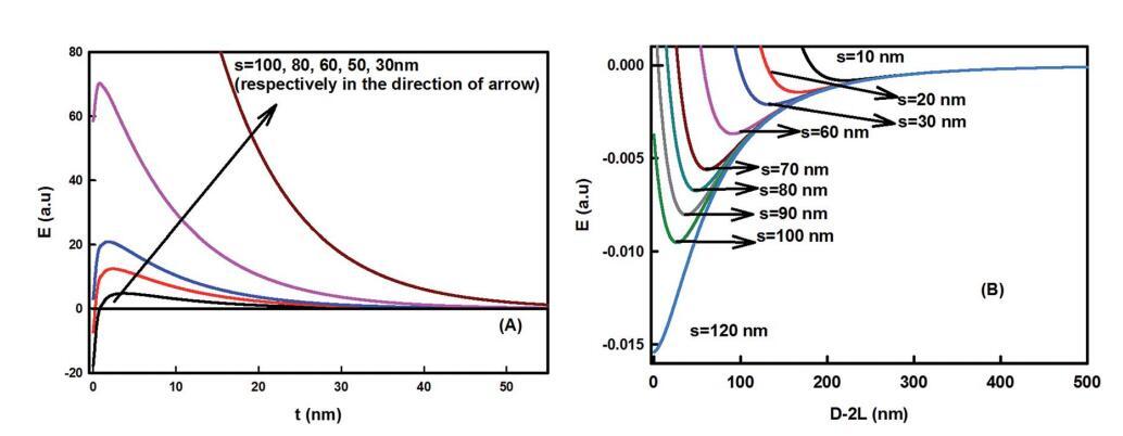 圖6足跡直徑對粘粒組件的影響。(A) 作為界面區(qū)域厚度函數的能量變化(L?60 nm,T?298 K,f?0.5,姜黃素納米顆粒半徑R?50 nm,疏水衰減長度x0?1 nm,界面張力?40 mN m-1)。(B) 粘粒–粘粒相互作用作為粒間分離D的函數,使用方程(5)計算。對于更大的封裝外形直徑,能量最小值變得更深,對于大于100 nm的s,能量最小值變得更有吸引力。