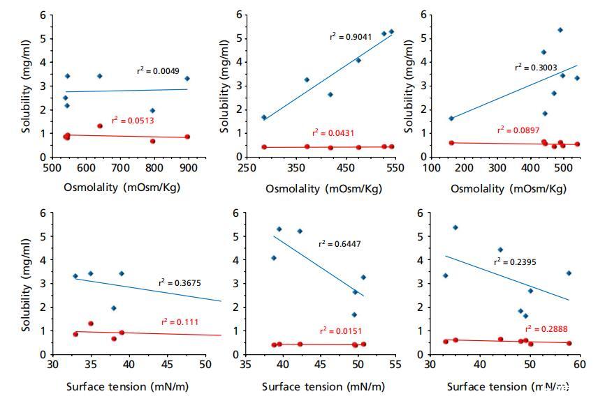 圖5:美沙拉秦(藍色鉆石)和潑尼松龍(紅色圓圈)在大鼠、兔和豬胃腸液(上清液)中的溶解度與其pH值、緩沖容量、滲透壓和表面張力的函數關系,其中藍色虛線表示除胃液外的美沙拉秦相關性。