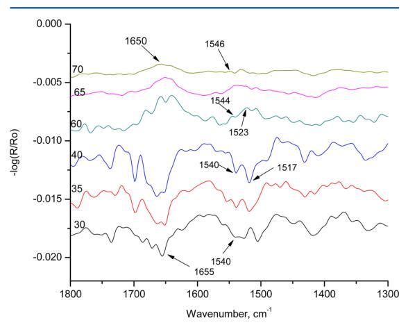 圖8顯示了HI-Langmuir單層在10 mN m處的p極化 ? 1在30、35、40、60、65和70°的六個不同角度。 在布儒斯特角之前,30、35和40 mN/m處的角未顯示出β片的特征帶。 所有三個角度顯示1655和1540厘米處的條紋 ? 1分別對應(yīng)于酰胺I和酰胺II吸收。 這條帶子在1517厘米處 ? 1,對應(yīng)于α-螺旋,在35°和40°中存在。 在布儒斯特角之后,所有60、65和70°的三個角都顯示出介于1650和1655之間的帶,這對應(yīng)于α-螺旋中的酰胺I吸收。 當(dāng)角度為60°時,在1523 cm處可以看到峰值 ? 1,對應(yīng)于β片。 光譜中的其他譜帶都不是α-螺旋或β-片的特征。 光譜表明HI在空氣中以α-螺旋的形式存在 ? 水界面。 在10 mN m的恒定壓力下,隨著角度的增加 ? 1,發(fā)現(xiàn)光譜中的α-螺旋特征減少。