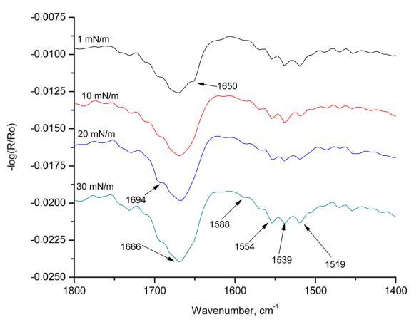 圖9顯示了在不同表面壓力下獲得的HI-Langmuir單層膜的s偏振輻照度。 在1 mN m的表面壓力下 ? 1,在1650 cm處存在一條帶 ? 1對應(yīng)于α-螺旋。 隨著表面壓力的增加,該條帶消失,并在1666 cm處并入該條帶 ? 1. 這條帶子長1666厘米 ? 1包括β-轉(zhuǎn)角和α-螺旋。 這條帶子有1694厘米長 ? 1對應(yīng)于β片。 這條帶子在1519厘米處 ? 1也對應(yīng)于α-螺旋。 在入射角為60°的情況下,在1670處觀察到的能帶可歸屬于存在于β-轉(zhuǎn)角中的空間約束C=O部分,或者由于β-薄片中的躍遷偶極耦合而注意到峰值中的分裂。 當(dāng)改變表面壓力時,最強(qiáng)烈的譜帶出現(xiàn)在1554和1539厘米處 ? 1,兩條帶均對應(yīng)于酰胺II區(qū)的α-螺旋。 所有三條主譜帶都表明HI-Langmuir單層的s極化輻照度中存在α-螺旋。