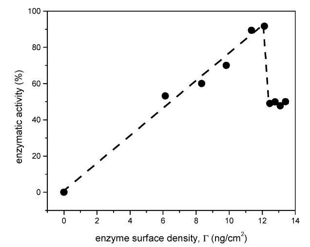 在5到18 mN/m的表面壓力下,DMPA的表面密度從1.45×1017分子/m2變化到2.30×1017分子/m2。 考慮到DMPA和DSAP都保留在界面上,單層的壓縮應(yīng)減少磷脂和蛋白質(zhì)的可用面積。 因此,可以估計(jì)酶的表面密度,并將其與酶活性關(guān)聯(lián)起來(圖2)。 高達(dá)12.1 ng/cm2(對(duì)應(yīng)于18 mN/m的表面壓力)時(shí),觀察到線性相關(guān)性,表明活性的增加直接反映了酶表面密度的增加。 然而,當(dāng)?shù)鞍踪|(zhì)表面密度高于12.1 ng/cm2時(shí),酶活性會(huì)突然下降。