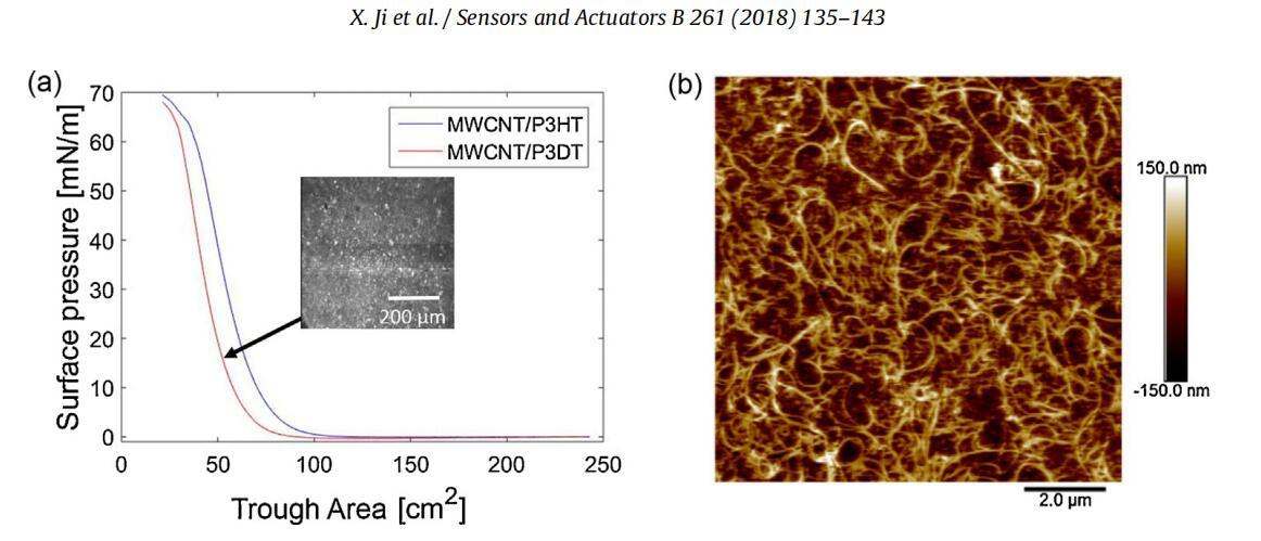 圖3。(a)MWCNT/P3HT和MWCNT/P3DT單分子膜的表面壓力與槽面積等溫線,以及15 mN/m下MWCNT/P3DT單分子膜的BAM圖像。(b)15 mN/m下轉(zhuǎn)移到PDMS基底上的MWCNT/P3DT單分子膜的AFM圖像。