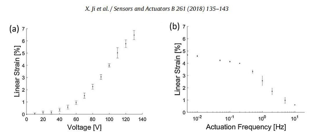 圖8。由1.4μm厚PDMS膜和單層電極組成的DEA的表征。(a)應(yīng)變與電壓曲線,顯示100V時約4%的線性應(yīng)變。(b)應(yīng)變與驅(qū)動頻率曲線。
