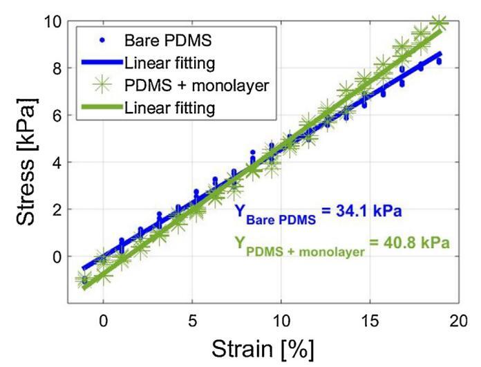 圖7。裸PDMS基板和覆蓋MWCNT/P3DT單層電極的相同PDMS基板的應(yīng)力-應(yīng)變曲線,允許測定單層剛度。