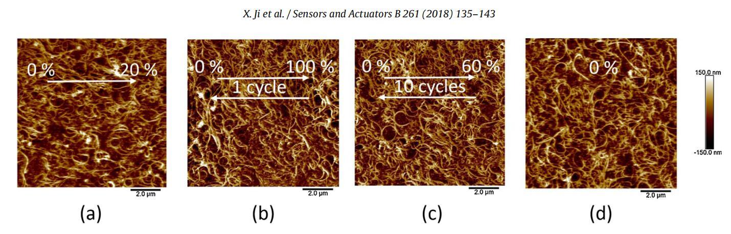 圖5。MWCNT/P3DT單層電極的AFM圖像。(a)在20%單軸應(yīng)變下。(b)在100%單軸應(yīng)變后恢復(fù)到0%應(yīng)變。(c)在10個周期后,以60%單軸應(yīng)變恢復(fù)到0%應(yīng)變。(d)在0%單軸應(yīng)變下,不施加任何應(yīng)變。箭頭指示拉伸方向。