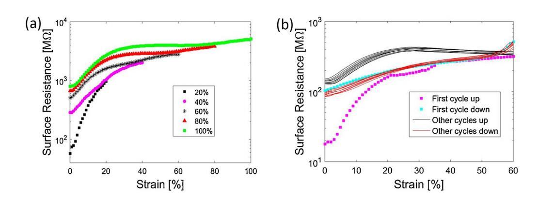 圖6a顯示了在20%和100%之間增加最大應(yīng)變的不同連續(xù)循環(huán)中,樣品表面電阻的變化。僅顯示拉伸循環(huán)。在前20%應(yīng)變期間,電阻增加約一個數(shù)量級,表明MWCNT網(wǎng)絡(luò)內(nèi)的互連比降低。當恢復(fù)到0%應(yīng)變時,電阻沒有達到其初始值,而是增加了6倍。這突出了由于機械變形導(dǎo)致的電性能的不可逆變化。隨著最大施加應(yīng)變的增加,每個循環(huán)都會發(fā)生這種情況。然而,可以觀察到,在恢復(fù)到0%應(yīng)變后,表面電阻的增加在60%應(yīng)變以上不太明顯。值得注意的是,單層電極在100%單軸應(yīng)變下仍保持導(dǎo)電。
