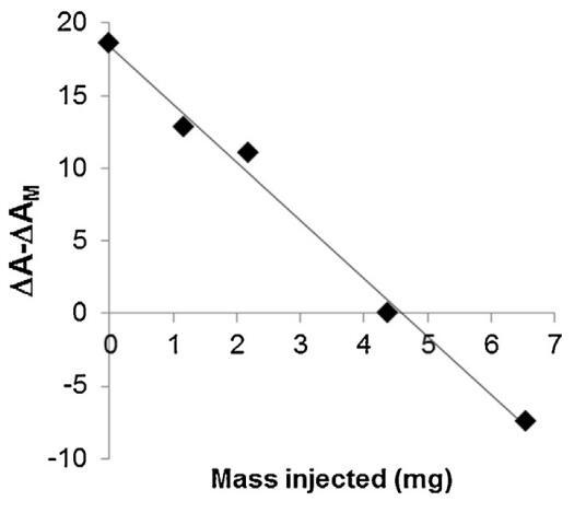 脂質體(不同濃度)對BSP蛋白的作用也如圖5所示。脂質體在進入亞階段前與精漿接觸。隨著脂質體中濃度的增加(曲線M/SP+C1至C4),BSP蛋白吸附引起的表面積增加逐漸延遲并減少。當含量達到4.37 mg(C3)時,界面上仍有少量BSP蛋白摻入,1600 s時出現肩部。在最高濃度(C4)下,未觀察到BSP蛋白摻入,分子面積的變化甚至比對照曲線更負,表明膜組分在亞相中輕微溶解。因此,脂質體作用于BSP蛋白的方式與LDL相同。最有趣的比例似乎介于C3和C4之間。根據確定面積變化與脂質體注射磷脂質量之間相互作用的曲線計算得出(圖6)。注射26.6 mg BSP的最佳質量為4.6 mg,即PC:BSP比為0.16(w/w)。