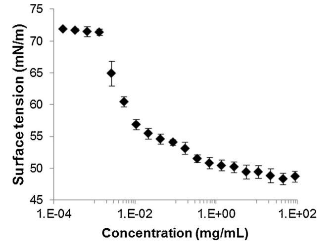 圖2。牛精漿溶液在空氣-水界面處的表面張力(±標準偏差),與提取物中所含蛋白質的濃度有關,并以對數標度表示(T=23.2℃±0.3℃,n=2,每個樣品重復4次)。