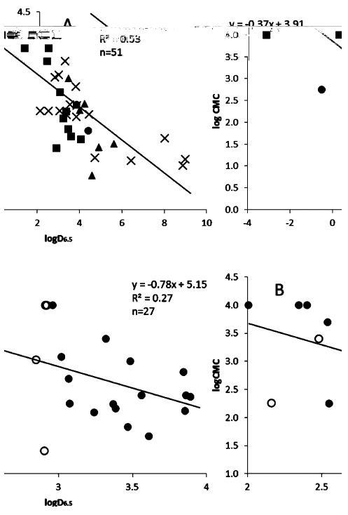 圖6。對于分類為酸的完整化合物組(A),根據pH 6.5(logD6.5)下的辛醇分配系數繪制對數CMC(μM)(■),基地(▲),中性離子(x)和兩性離子(?),以及logd2和logd4(B)范圍內的化合物。圖B中的開放圓對應于從文獻檢索、預測或從pH值為7.4的logD推斷的logD值。高于或低于檢測限的值在檢測限處繪制。