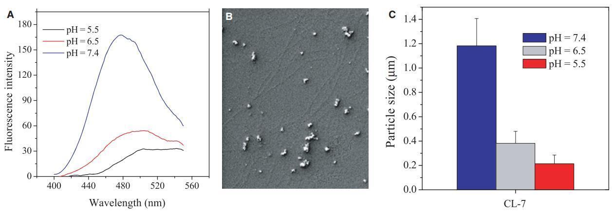 圖6:(A)pH值影響不同pH值下溶液(40 lM)中CL-7的聚集。1-苯胺基萘-8-磺酸(1,8-ANS)濃度固定在20 lM,激發波長設置為369 nm。肽聚集溶解通過1,8-ANS發射峰在500 nm處的紅移和熒光強度降低來指示;(B)pH=7.4的40 lM肽溶液中形成的CL-7聚集體的掃描電子顯微鏡圖像;(C)隔夜培養后測量溶液中肽CL-7(80 lM)的粒徑。數據代表至少三個獨立測試的平均值和標準差。