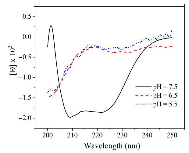 除了肽聚集狀態外,細胞表面pH值也可能影響pH敏感肽的二級結構。已經發現,肽插入細胞膜通常伴隨著肽二級結構的變化(17)。肽鏈折疊成特定構象,通常為α螺旋結構,這被證明是肽插入細胞膜的必要過程(6)。盡管所有選定的pH敏感裂解肽在生理pH下均采用螺旋結構,但當環境pH降至肽的過渡pH以下時,它們變成隨機線圈(表2和圖7)。從無規螺旋轉變為螺旋是肽插入膜的能量有利過程(6)。因此,細胞表面pH值也可能通過改變pH敏感肽的二級結構而影響其活性。