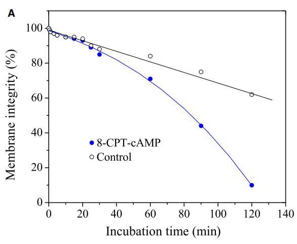 肽與細胞膜的相互作用包括三個步驟:(i)陽離子肽對細胞表面的靜電吸引;(ii)肽向結合平面的轉變;(iii)將肽插入細胞膜。通過研究pH敏感肽CL-7誘導的膜損傷動力學,研究了肽-細胞相互作用的細節(圖5A)。CL-7誘導的A549細胞膜滲漏呈時間依賴性,并呈線性曲線。盡管在8-CPT-cAMP處理的A549細胞上,CL-7介導的細胞膜損傷在開始時遵循相同的曲線,但它偏離了線性曲線,并在培養15-20分鐘后加速(圖5A)。在脂質單層膜上進行的平行膜張力研究表明,CL-7與細胞膜的相互作用以表面張力快速增加的初始階段為特征,隨后是表面張力松弛的第二階段(圖5B),與肽與膜結合和肽插入相關膜,分別。盡管CL-7與脂膜結合是一個快速過程(3-5分鐘),但肽插入脂膜大約需要20分鐘才能完成。這兩個實驗的結果非常吻合,這意味著細胞表面pH對CL-7的顯著影響發生在肽-細胞相互作用的后期,即肽插入細胞膜。