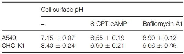 表3:8-CPT-cAMP-和巴非霉素A1在具有生理pH的培養基中誘導的細胞表面pH變化