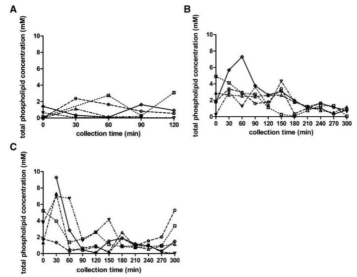 圖4。在禁食(A)、喂食(B)和高脂喂食(C)狀態下,總磷脂濃度(mM)隨餐后時間的變化而變化。(--?--)主題1(··?··)主題2,(·–·)△·–·)主題3,(·-·▽·–·)主題4,(-◇–)科目5。