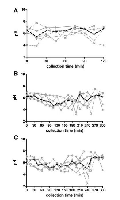 圖1。五名健康受試者在禁食(A)、喂食(B)和富含脂肪的喂食(C)狀態HIF中的個人和中值pH值隨時間的變化。(--?--)主題1(··?··)主題2,(·–·)△·–·)主題3,(·-·▽·–·)主題4,(-◇–)受試者5,(――中位)。