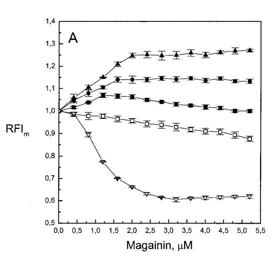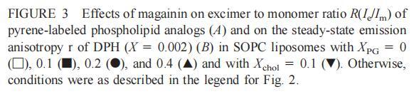 有趣的是,在存在酸性磷脂的情況下,肌動蛋白/脂質的摩爾比(在該摩爾比下,肌動蛋白的初始增量趨于穩定)分別為1:21、1:16和1:12.5,對應于XPG=0.1、0.2和0.4(圖2A),分別產生1:2、1:3和1:5的肌動蛋白/磷脂化學計量比。同時,DPH的初始r增量在magainin/脂質摩爾比為~1:30、1:12和1:5時趨于平穩(XPG分別為0.1、0.2和0.4),對應于大約1:3、1:2.5和1:2的magainin/PG化學計量比(圖3)。據報道,在這些肽/脂質摩爾比下,magainin可插入含酸性磷脂的膜中(Ludtke等人,1994年)。此外,已經證明,雙分子層中magainin的=-螺旋的方向取決于肽與脂質的摩爾比,在上述化學計量比下,螺旋應垂直于膜表面插入,在含PG的膜中形成孔(Ludtke等人,1996)。這些孔不僅由兩親螺旋的極性面組成,而且還由脂質的極性頭基組成,內外單層通過這些孔襯脂質是連續的。膜中的這種結構可能會降低探針芘部分微環境的極性,從而提高其量子產率。有趣的是,當XPG>0.1時,magainin 2逐漸降低Ie/Im值(圖3 A),這與增強的酰基鏈順序減少脂質側向擴散的速率一致。然而,由于magainin 2已經在XPG=0.1時增加了r,Ie/Im沒有變化,我們可以得出結論,PPDPG探針向微區富集以及其橫向擴散的減少正在發生。