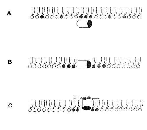 對于測試的所有單層組成,吲哚青霉素的πc值超過了馬蓋寧2的測量值(圖1 c),表明該肽在酰基鏈之間有效插入和插層。吲哚西丁在~38 mN/m的交叉點值得關注。在后一個表面壓力之下,表面壓力的增量??在PG存在的情況下,吲哚西丁引起的反應增強,而在較高的初始脂質堆積密度下觀察到相反的反應。有趣的是,不管脂質成分(即PG的存在)如何,交叉點幾乎保持不變,因此表明它可以完全由表面壓力決定,而不管靜電相互作用如何。一種可能的機制是,在π0>38 mN/m時,吲哚西丁以壓力依賴的方式改變其在單層中的取向,可能是從其長軸相對于層平面的平行到垂直取向(圖9,B和C),從而減少面積/肽并減少?π.此外,一些靜電結合吲哚肽的PG分子也可能與單層中的磷脂方向不同。換句話說,吲哚西丁與其相關的PG將形成一種超分子復合物,其取向將取決于壓力。這在圖9中示意性地示出。重要的是,所提出的肽連接磷脂的重新定向將與最近提出的模型兼容,在該模型中,穿過雙層的孔表面的一部分將由脂質頭基構成(Ludtke et al.,1996)。