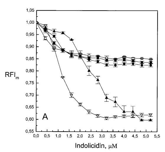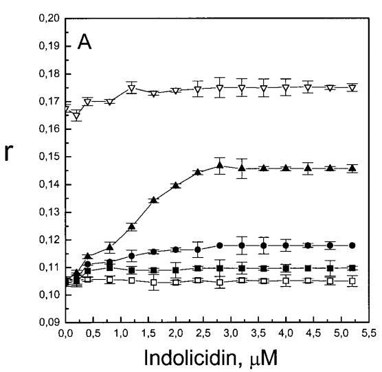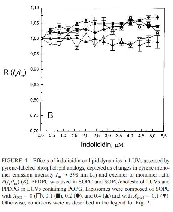 與magainin 2類似,吲哚青霉素與陰離子和兩性離子囊泡的膜結合非常不同(圖1b、4和5),與先前的平衡透析研究一致(Ladokhin et al.,1997)。雖然芘熒光的猝滅顯示吲哚肽被分配到SOPC雙層中,但對膜酰基鏈順序幾乎沒有影響(圖5)。相反,吲哚西啶與陰離子膜的相互作用導致脂酰鏈順序增加,明顯表現為DPH熒光各向異性增加,并對XPG呈S形依賴(圖5)。與magainin 2相反,吲哚西丁導致芘單體和準分子發射強度顯著平行降低,與脂質成分無關,Ie/Im變化較?。▓D4)。相應地,吲哚西丁誘導酸性PG富集到微區。有趣的是,在吲哚西丁/脂質摩爾比為1:20以下,芘Im的減少順序為XPG=0.40.20.10(圖4a),而在吲哚西丁/脂質摩爾比為1:10時,Im的減少對XPG的依賴性相反。這種變化的可能機制如下。在低肽/脂摩爾比時,吲哚西丁似乎被調節到雙層界面(Ladokhin等人,1997),芘標記鏈的鏈反轉(Holopainen等人,1999)使該部分更接近雙層表面,從而允許其與吲哚西丁的基本殘基接觸。后者通過π-陽離子相互作用導致芘部分的碰撞猝滅。然而,隨著XPG的增加,我們可以預期PG頭基與吲哚西丁的堿性殘基發生靜電結合,從而阻止芘與吲哚西丁的陽離子殘基之間的直接接觸。隨著肽濃度的增加,吲哚肽的膜結合以協同方式增強,猝滅效率的逆轉可能涉及雙分子層中脂肽復合物的聚集。因此,在酸性含磷脂的膜中,吲哚對芘的猝滅作用較小。當吲哚肽的濃度增加到肽/脂比1:10以上時,肽將以高度協同的方式并入膜的?;渽^域(Ha等人,2000)(圖9 E),而在中性膜中,肽位于界面(圖9 D)。插入吲哚西丁的量取決于雙層中的XPG,導致吲哚西丁的Trp殘基的猝滅占主導地位,與XPG=0.4時Im的顯著減少一致(圖4a)。
