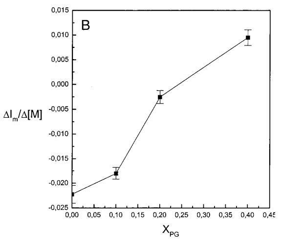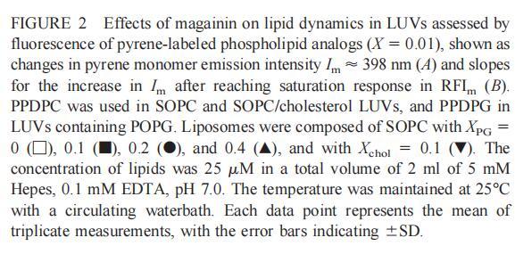 繼上述單層研究之后,有興趣探索肽對脂質動力學的影響。這是通過使用熒光光譜和不同脂質成分的LUV完成的,記錄芘標記的熒光磷脂類似物PPDPC或PPDPG的發射光譜(均為X=0.01)。對于SOPC LUV,添加magainin 2導致芘熒光顯著猝滅,芘單體和準分子發射強度平行降低,如Im所示(圖2)。作為XPG的一項功能,還研究了馬蓋寧2與脂質體結合的后果。當XPG從0.1增加到0.4時,觀察到由于magainin 2在398 nm處逐漸增強的Im(RFIm),而Im的初始增量在明確定義的PG/magainin 2化學計量比~2、3和5時趨于平穩(圖2 A)。在這個初始階段之后,直到給定的化學計量比,還有第二個過程,其斜率也隨著XPG的增加而增加(圖2b)。在XPG=0和0.1時,Magainin 2僅引起Ie/Im的輕微變化,而在XPG=0.2和0.4時,分別減少10%和25%是明顯的(圖3 A)。為了區分脂質動力學中兩種性質不同的變化,即側向遷移率和微結構域形成,作為上述Ie/Im變化的根本原因,我們還通過測量DPH的熒光各向異性r來評估酰基鏈順序的變化(圖3 B)。在缺乏酸性磷脂的情況下,Magainin 2幾乎不會引起r的變化(圖3B)。然而,隨著XPG的增加,加入magainin 2后脂質堆積和?;滍樞蛑饾u增加(圖3b),XPG=0.4時,r最大增加1.4倍。值得注意的是,XPG=0.1時Ie/Im沒有變化以及?;滍樞虻脑黾颖砻鱌PDPG正在發生微觀富集。有趣的是,在存在膽固醇(Xchol=0.1)的情況下,由于馬蓋寧2的作用,Im和Ie都顯著降低,Ie/Im的變化不顯著(圖2A和3A)。如前所述(van Ginkel et al.,1989),添加肽前r的增加(圖3 B)揭示了通過在膜中摻入膽固醇而增強的膜順序。然而,在膽固醇存在的情況下,magainin 2對r沒有進一步的影響(Xchol=0.1,圖3b)。