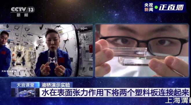 王亞平解釋,在地面重力的環境下,水的表面張力微不足道,所以同學們無法用純水做出一個液橋。而在太空中,由于重力消失,液體表面張力就可以用液體搭建出一座橋。