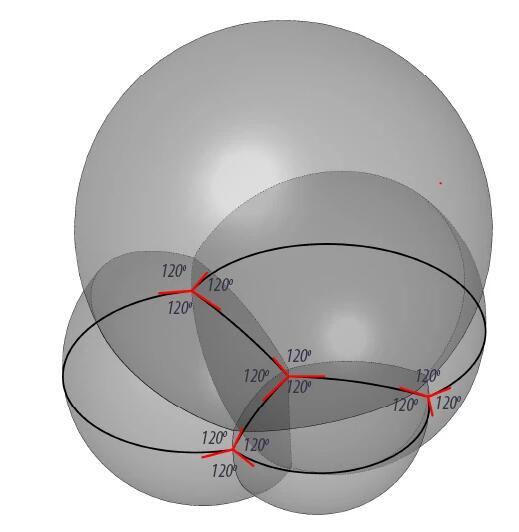 現(xiàn)在我們知道了表面張力決定泡泡的連接方式,泡沫總會找到一種具有最小表面張力的結(jié)構(gòu),也就是使總表面積最小的結(jié)構(gòu)。但是,關(guān)于泡沫的結(jié)構(gòu)還需要考慮另一個問題,即力學(xué)上的穩(wěn)定。在連接點處,沿著不同方向的作用力必須達到平衡。無論是泡泡筏的平鋪還是泡泡堆的四面相連,都是能滿足這一要求的連接方式。