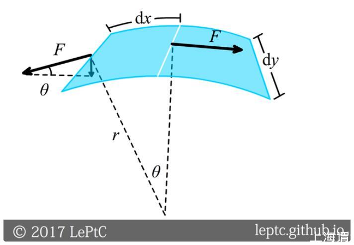 假設(shè)膜在x的方向彎曲,曲率半徑為r,作用在一個(gè)微小的長(zhǎng)度dy上的表面張力F=σdy,sinθ≈dx/r,指向球內(nèi)的合力為Fsinθ=σdxdy/r(沒(méi)有乘2是因?yàn)槊織l邊的力被相鄰兩個(gè)面元共用),這一力由壓強(qiáng)差平衡,除以面積dxdy得壓強(qiáng)差為σ/r。對(duì)于球面x和y方向都彎,故球內(nèi)壓強(qiáng)比球外大2σ/r(對(duì)于肥皂泡因?yàn)橛袃蓪咏缑孢€要再乘2)。