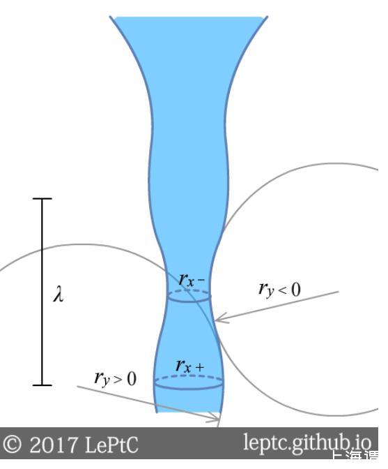 這一現(xiàn)象稱為普拉托-瑞利不穩(wěn)定性(Plateau–Rayleigh instability)。我們?cè)谥鶢罱缑嫔霞右粋€(gè)波長(zhǎng)為λ的擾動(dòng),橫截面上的曲率變化rx是促進(jìn)柱的分裂的,但縱截面上ry的曲率變化會(huì)阻礙分裂,后者的效應(yīng)隨λ變長(zhǎng)而減弱。