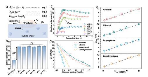 含有聚乙烯亞胺(PEI)和聚苯乙烯磺酸鈉(PSSNa)的水溶液滴在水表面自發鋪展成膜(圖1,圖2)。一般而言,水溶液液滴與水接觸時首先發生向水中的擴散與混溶,而非鋪展。為了抑制水-水擴散與混溶,作者設計了PEI-PSSNa和混合溶液,其pH為堿性。當該溶液液滴與酸性水接觸時,水中含有的大量質子促使PEI高分子鏈上的氨基質子化,隨后帶正電的PEI與PSSNa在水-水界面上發生靜電絡合,有效抑制了溶液向水中的擴散與混溶。與此同時,PEI-PSSNa的表面張力比水低,液滴因此在水表面可自發鋪展,而非混合。二者協同,促使了水溶液液滴在水面進行自發鋪展。