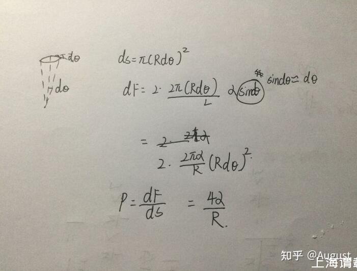 (在這里因?yàn)橐粋€(gè)肥皂泡膜與兩個(gè)介值相接觸,所以膜的兩側(cè)各形成一個(gè)表面張力,由于肥皂泡厚度很小,所以這兩個(gè)表面張力近似相等)