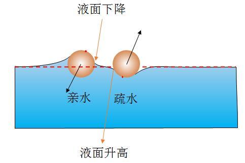 親水的使疏水的固體附近液面沒那么低,疏水的使親水的物體附近液面沒那么高,表面為相互排斥。