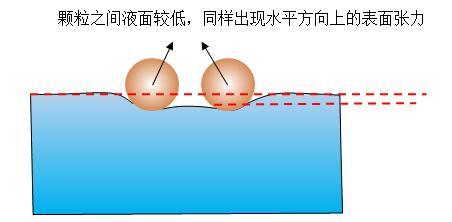 這時,讓兩個親水的物體緩慢靠近,當一個處于另外一個的毛細作用力范圍時,由于毛細作用的相互耦合作用,兩個球形顆粒之間的液面會比兩側要高,這就打破了原來每個球形顆粒所受液體表面張力的對稱性,使表面張力的合力不再是垂直向下。出現了水平方向的分力,表現為相互吸引,如圖3。