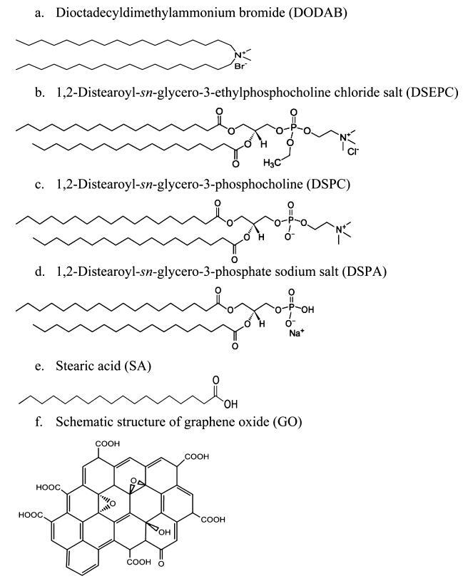 正電荷脂質二十八烷基二甲基溴化銨(DODAB)和1,2-二硬脂酰-sn-甘油-3-乙基磷酸膽堿氯化鹽(DSEPC)、中性電荷兩性脂質1,2-二硬脂酰-sn-甘油-3-磷酸膽堿(DSPC)和負電荷脂質1,2-二硬脂酰-sn-甘油-3-磷酸鈉鹽(DSPA)購自Avanti Polar Lipides(Alabaster,AL)。硬脂酸(SA)購自SigmaAldrich(密蘇里州圣路易斯)。由于頭部基團中存在陰離子磷酸鹽和陽離子季銨中心,DSPC帶中性電荷,如方案1c所示。由于羧基脫質子化,SA被認為是帶負電的分子。所有這些脂質在非極性尾部都有18個碳鏈烷基。光譜級氯仿和甲醇來自MP Biomedicals(Solon,OH)。單層GO購自ACS Material LLC(馬薩諸塞州梅德福德)。所有這些化學品均未經任何進一步凈化?;瘜W結構如圖1所示。實驗中使用的去離子水來自Modulab 2020水凈化系統(德克薩斯州圣安東尼奧)。去離子水的電阻率、表面張力和pH值在20.0±0.5°C時分別為18 MΩ·cm、72.6 mN/M和5.6。所有實驗均在恒溫20.0±0.5°C、濕度50±1%的潔凈室(1000級)中進行。