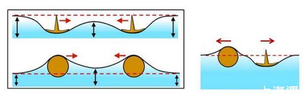 為什么漂浮在液面上的兩固體,均比水重或均比水輕時表面張力使之相互接近;一個比水重一個比水輕時相互遠離?