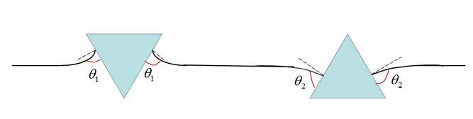上圖便是水上兩個漂浮小球的吸引與排斥的判斷方法。值得注意的是,我們這里并沒有提及小球的浸潤性,也就是說,浸潤性與橫向毛細力的性質并不直接相關。實際上,橫向毛細力還可以分為漂浮橫向毛細力和浸沒橫向毛細力。我們討論的情況是漂浮橫向毛細力,由小球的重力引起,題主的所說的浸潤性應該換為小球的輕重(與水相比)。例如圖(a)里是兩個比水重的小球,表面張力將其往上拉。圖(b)是兩個比水輕的小球,表面張力將其往下拉。表面張力的方向恰好就對應了前述接觸線處液面的傾斜角。題主的所要表達的意思其實是: