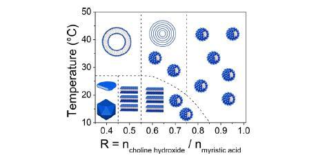 圖1.氫氧化膽堿/肉豆蔻酸體系整體相行為的示意圖,作為R和溫度的函數(shù),根據(jù)參考文獻30的先前研究確定。