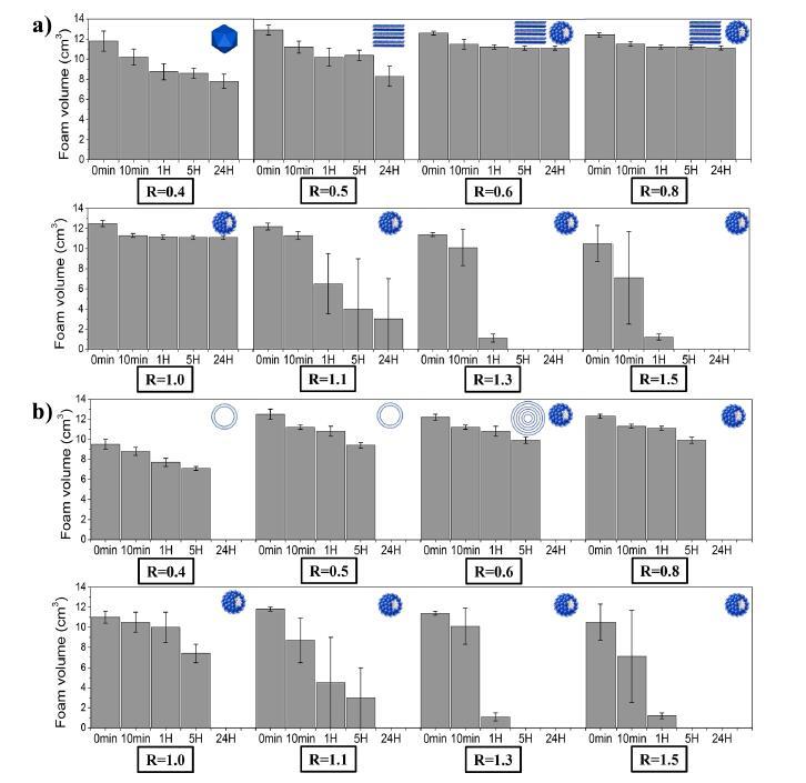 圖5:在兩種溫度下(a)15°C和(b)35°C下,通過手搖動不同摩爾比(R)產生的泡沫體積隨時間的變化。示意圖表示作為R和溫度的函數的大量自組裝體。