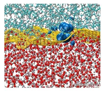 大多數DFT模擬的計算要求通常與電子數的立方成比例。但對于具有大帶隙特性的絕緣系統,僅線性擴展的DFT技術可用于研究電子結構。利用這種方法,哈桑納利和他的同事在納米尺度上模擬了由數千個原子組成的疏水界面的電子效應。下圖顯示了模擬的油水界面。