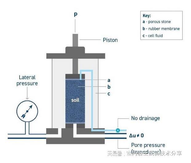這里以有效應(yīng)力來衡量剪切強(qiáng)度。試樣飽和并允許在所需的約束壓力下進(jìn)行固結(jié)(土壤固結(jié)是改變其結(jié)構(gòu)和含水量的過程)。一旦固結(jié),試樣就被施加了一定的荷載,在此期間不允許排水,以便測(cè)量孔隙壓力。