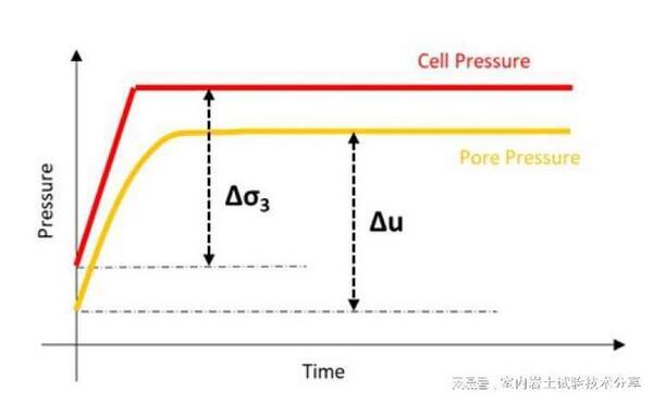 在此過程中,計(jì)算孔隙壓力系數(shù)B以確定飽和度。重復(fù)這些步驟,直到樣品飽和。大多數(shù)標(biāo)準(zhǔn)規(guī)定,大于0.95的B值表明標(biāo)本已充分飽和。B值計(jì)算為一個(gè)比值其中?u=孔壓變化?σ3=圍壓變化;