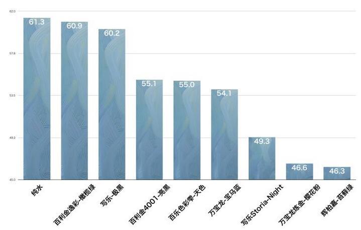 1.達到60mm接近純水的【高流動性組】,代表樣本為【百利金逸彩橄欖綠】、【寫樂極黑】;