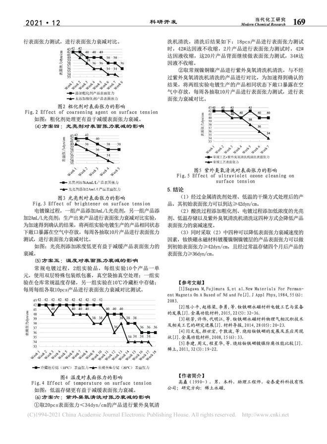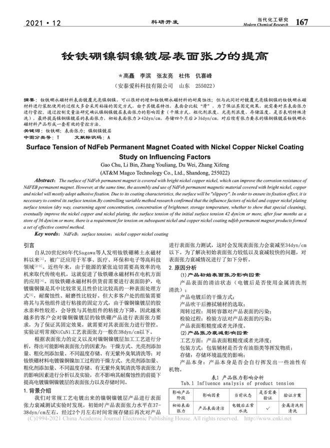 摘要:釹鐵硼永磁材料表面鍍覆光亮鎳銅鎳,可以很好的增加釹鐵硼永磁材料的耐腐蝕性;但與此同時(shí)對鍍覆光亮鎳銅鎳的釹鐵硼永磁材料進(jìn)行裝配使用的過程大多會采用粘接的固定方式,由于其鍍層特性,表面會比較"滑",為了保證其固定效果,就需要對其表面張力進(jìn)行管控。通過控制變量法研究確認(rèn)鎳銅鎳鍍層表面張力的影響因素(干燥方式、粗化劑濃度、光亮劑濃度、存儲溫度、是否表明特殊清洗),最終提高鎳銅鎳鍍層的表面張力,初始表面張力≥42dyn/cm,存儲四個(gè)月后≥36dyn/cm,對后續(xù)有張力要求的鎳銅鎳鍍層釹鐵硼永磁材料產(chǎn)品形成一套有效的管控方法。