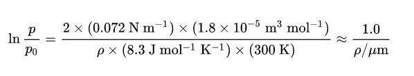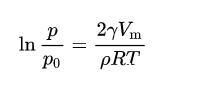聽(tīng)說(shuō)公式會(huì)讓人不想看科普所以我只講這一個(gè)公式好了(x)其中,R是通用氣體常量,T是溫度,ρ是液滴表面的曲率半徑。p?是表面平整的液體原本的蒸氣壓,p是這個(gè)液滴的蒸氣壓。p?、表面張力γ、液體摩爾體積V_m對(duì)于同種溫度的同種液體可以認(rèn)為近似是常量。把以上常量合并為常量C,所以在同樣溫度下,對(duì)于同種液體,可以得出如下的半定量關(guān)系: