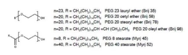 如果將不同分子量的聚乙二醇單鏈與簡(jiǎn)單的脂肪烷基長(zhǎng)鏈連接,就獲得聚乙二醇烷基醚(Polyoxyethylene Alkyl Ethers),包括月桂醚烷基、油醇醚烷基、硬脂醇烷基、十六烷基等,在制劑中可作為乳化劑、增溶劑和潤(rùn)濕劑等。
