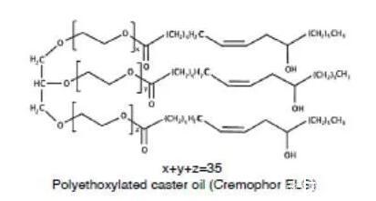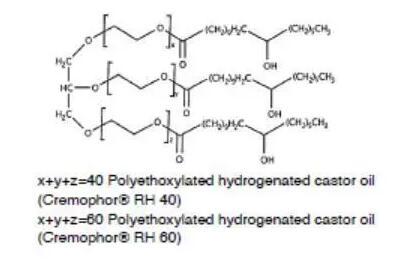 另一類(lèi)重要的非離子表面活性劑是聚氧乙烯蓖麻油(Cremophor)或聚氧乙烯氫化蓖麻油(Cremophor RH)。蓖麻油是蓖麻油甘油三脂,與環(huán)氧乙烯反應(yīng),親水性的氧化乙烯結(jié)構(gòu)便插入到蓖麻酸和甘油之間,便得到了聚氧乙烯蓖麻油,如果蓖麻油中的雙鍵加氫飽和后,再與環(huán)氧乙烯反應(yīng),那么得到的便是聚氧乙烯氫化蓖麻油。環(huán)氧乙烯和蓖麻油的反應(yīng)位點(diǎn)是隨機(jī)的,因此得到的表面活性劑是一種混合物,也包括未反應(yīng)的蓖麻油和均聚形成的聚氧乙烯。不同種類(lèi)的聚氧乙烯蓖麻油或聚氧乙烯氫化蓖麻油是通過(guò)參與反應(yīng)的氧化乙烯和蓖麻油或氫化蓖麻油的比例決定的,例如Cremophor EL 40或Cremophor RH 40,其中40代表的便是混合物中氧化乙烯和蓖麻油的摩爾比。這類(lèi)表面活性劑的HLB一般在12以上,常用作難溶性藥物的增溶。