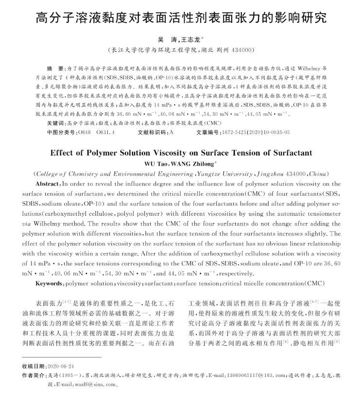 為了揭示高分子溶液黏度對表面活性劑表面張力的影響程度及規律,利用全自動張力儀,通過Wilhelmy吊片法測定了4種表面活性劑(SDS、SDBS、油酸鈉、OP-10)水溶液的臨界膠束濃度以及加入不同黏度高分子(羧甲基纖維素、多元醇聚合物)溶液前后的表面張力。結果表明:加入不同黏度高分子溶液后,4種表面活性劑的臨界膠束濃度并沒有發生變化,但臨界膠束濃度對應的表面張力均有小幅提升,且高分子溶液黏度對表面活性劑表面張力的影響在一定范圍內與黏度并無明顯的線性關系;在加入黏度為14 mPa·s的羧甲基纖維素溶液后,SDS、SDBS、油酸鈉、OP-10在臨界膠束濃度對應的表面張力分別為36.60 mN·m~(-1)、40.06 mN·m~(-1)、54.30 mN·m~(-1)、44.05 mN·m~(-1)。