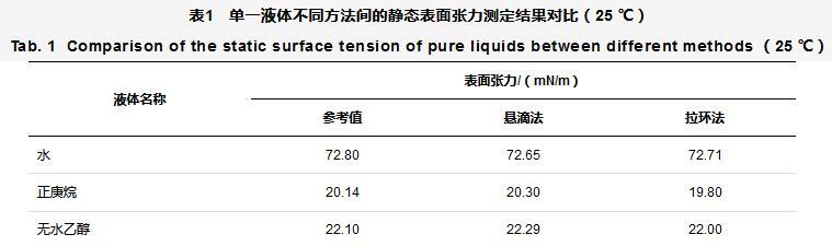 表1單一液體不同方法間的靜態(tài)表面張力測定結(jié)果對比(25℃)