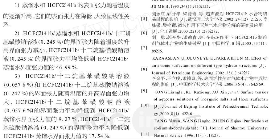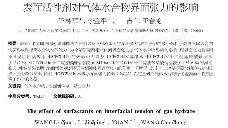 【摘要】:表面活性劑能夠減小液體的表面張力以及兩相液體間的界面張力,界面張力的減小有利于促進(jìn)氣體水合物快速形成和提高水合物儲(chǔ)氣能力.為定量研究?jī)上嘁后w間界面張力對(duì)氣體水合物形成的影響,用界面張力儀實(shí)測(cè)不同溫度時(shí)蒸餾水、HCFC-141b的表面張力以及HCFC-141b/蒸餾水、HCFC-141b/十二烷基硫酸鈉溶液(0.247%)、HCFC-141b/十二烷基磺酸鈉溶液(0.245%)、HCFC-141b/十二烷基苯磺酸鈉溶液(0.057 6%)的界面張力,測(cè)試結(jié)果表明,表面活性劑對(duì)降低兩相液體間界面張力的作用十分明顯,其中十二烷基苯磺酸鈉溶液對(duì)降低界面張力最為突出,降到HCFC-141b/蒸餾水界面張力值的9%左右,為定量研究氣體水合物等優(yōu)選表面活性劑提供了科學(xué)的依據(jù)。